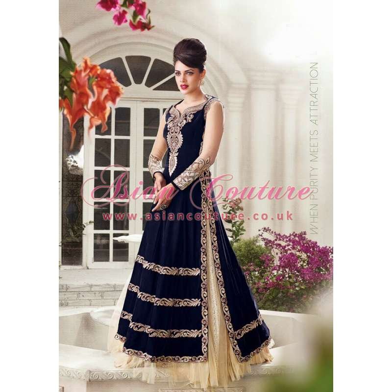 An enticing dark blue Zoya Splash (replica) dress includes lehenga, trouser, duppatta, velvet top. Luxurious velvet straight cut ensemble. On superfine micro-velvet fabric with opulent patch embroidery. Comes with an option of Lengha or Salwar fabric! approx. measurements in inches, Bust 44, Length 55, skirt 40 Embrace yourself in this stunning skirt style wedding wear outfit.